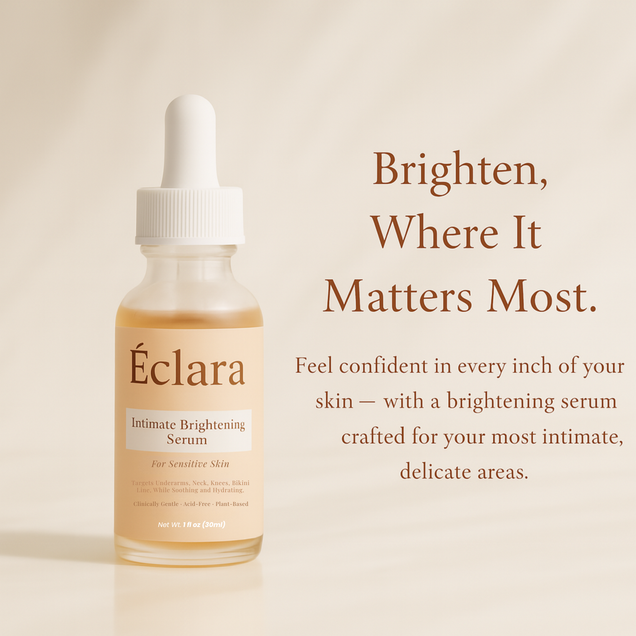 You can apply Éclara to the underarms, back of neck, inner thighs, bikini line, knees, elbows, and other intimate folds where darkness or uneven tone may appear.